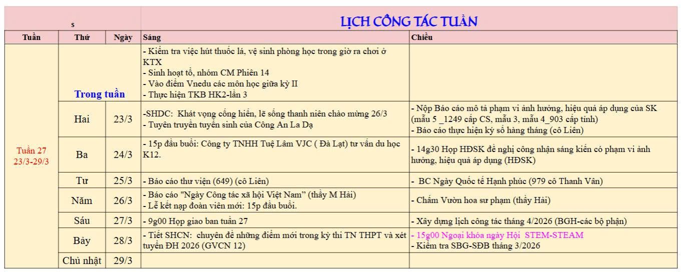 Lịch công tác tuần 27 năm học 2025-2026
