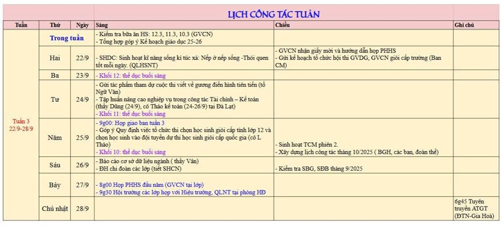 Lịch công tác tuần 3 năm học 2025-2026