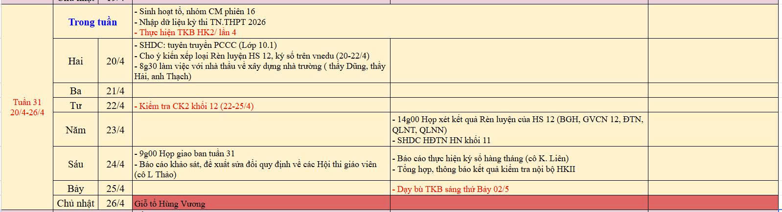 Lịch công tác tuần 31 năm học 2025-2026