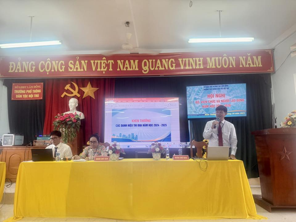 Thực hiện Công văn số 794/SGDĐT-VP ngày 11/9/2025 của Sở GD&ĐT Lâm Đồng về thực hiện quy chế dân chủ ở cơ sở và tổ chức Hội nghị CB, CC, VC và NLĐ, chiều nay, Trường Phổ thông Dân tộc Nội trú đã long trọng tổ chức Hội nghị Cán bộ, Viên chức và Người Lao động năm học 2025 – 2026.